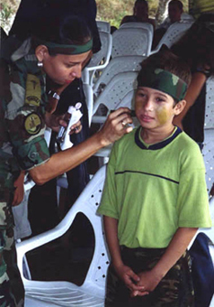 A Colombian army psychologist applies camouflage make-up to a small child in Saravena, Arauca. (Credit: Garry Leech)