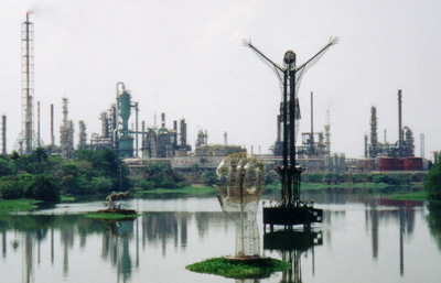 The statue of the “Oil Christ” in front of Colombia’s largest oil refinery in Barrancabermeja, Santander. (Credit: Garry Leech)