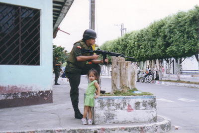 A small girl stands by a National Police officer in Saravena, Arauca. (Credit: Garry Leech)